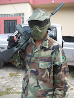 are team was almost all together yesterday. we had everyone but josh. its ok tho josh, we had fun without you! are team yesterday was me, cueto, lujan, mike, wiglz, and cory boy. we played two games in the jungle and lost both -.- then we went to "the House" and played CQB. it was so awesome! our team started in the house while the other team (ryans uncles) tried to "take over" the second floor of the house...and they did...it was still tons of fun even though we lost....twice...then we tried taking the second floor while the other team defended. me and cory boy went up the stairs in the house next to it and across the roof to try and get in through the bathroom window. cueto and wiglz went around and tried to get in through the front and up the stairs. mike sniped from the jungle and lujan met up with me and cory boy after he wondered around for a while...i think that was the only game we won that day but we all had a blast and cant wait till next time!!